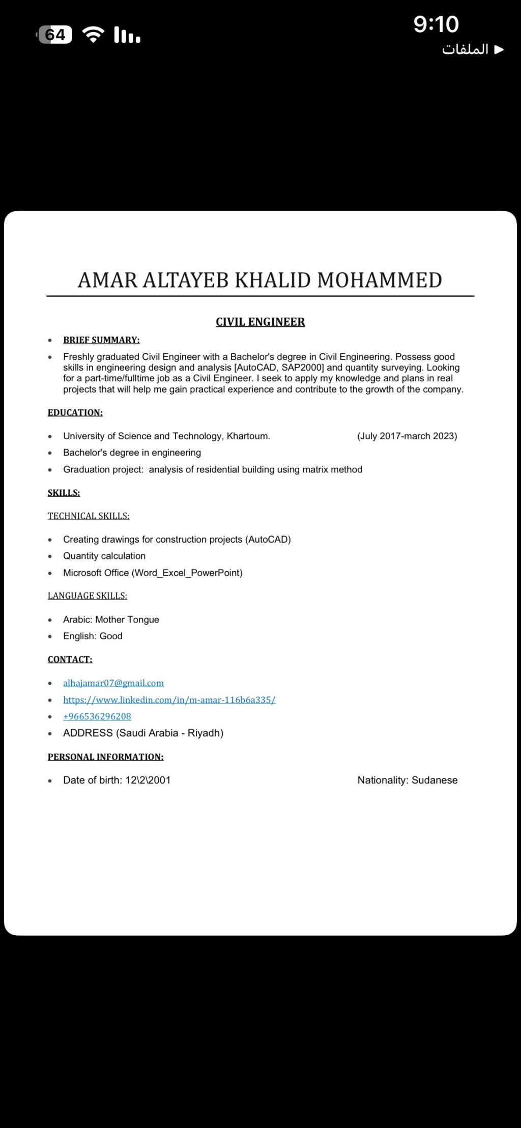 مهندس مدني بكالوريوس في الهندسة المدنية سوداني الجنسية ابحث عن فرص تدريب في المواقع انشاءات وتشطيبات