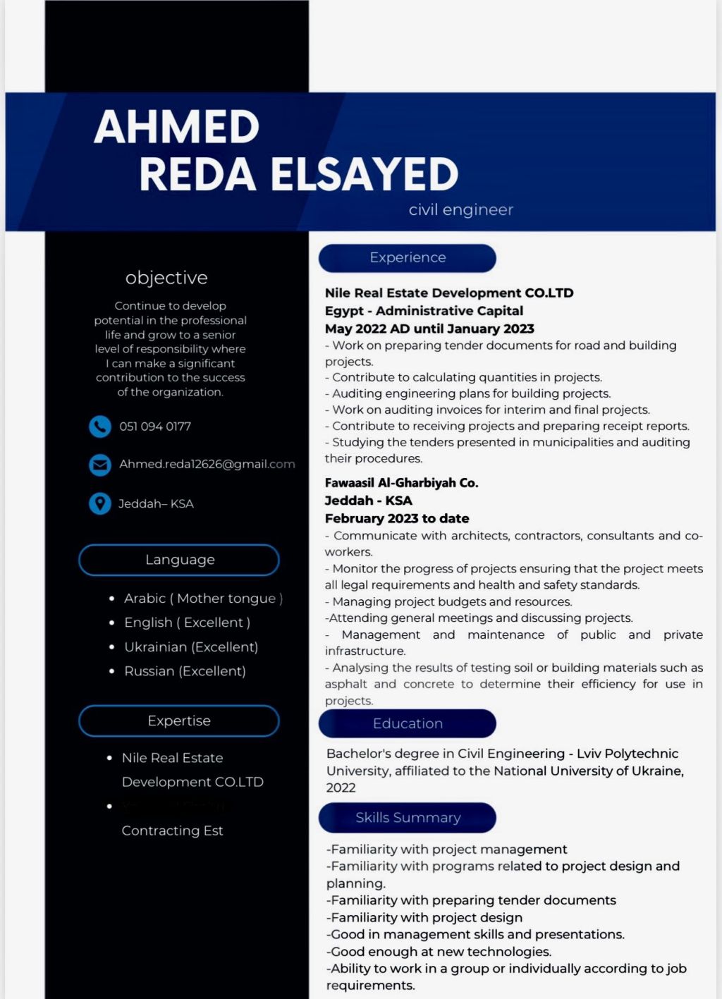 أنا مهندس مدني تنفيذ مقيم في جدة خبرة 3 سنوات