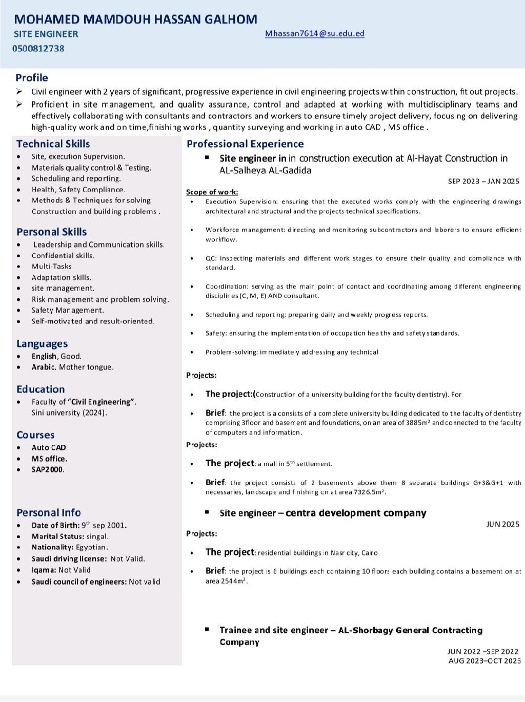 Civil engineer with two years of experience seeking employment. I possess strong on - site experience in project handover and finishing, and am proficient in AutoCAD and MS Office. I currently lack a valid residency permit but am available to work immediately. I require sponsorship transfer and reside in Al Hamra district, Riyadh