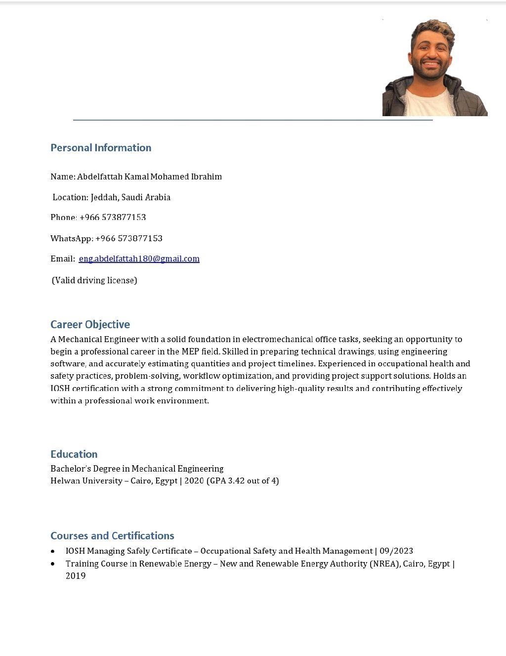 Mechanical Engineer with 2 years of experience in firefighting field. looking for a job opportunity (full or part time) transferable Iqama and valid driving license