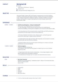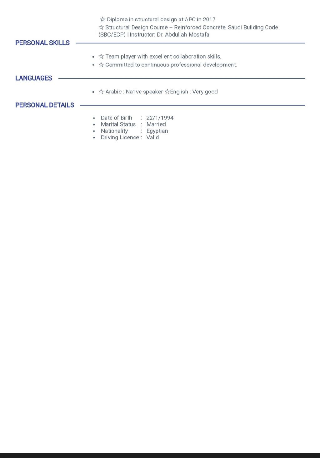 مهندس مدني مصري خبرة 7 سنوات منهم 3 سنوات كمهندس موقع، 4 سنوات كمهندس تصميم انشائي، القدرة علي اختيار نظام انشائي يناسب البحور واستخدام المبنى، عمل نمذجة ثلاثية الأبعاد باستخدام برنامج الايتابس والسيف واخراج اللوحات التصميمية بشكل جيد، وعمل النوتة الحسابية