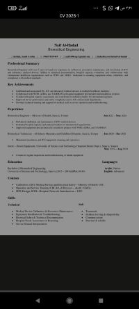 مهندس اجهزة طبية أملك خبرة خمس سنوات في مجال الصيانة والتسويق مقيم في السعودية