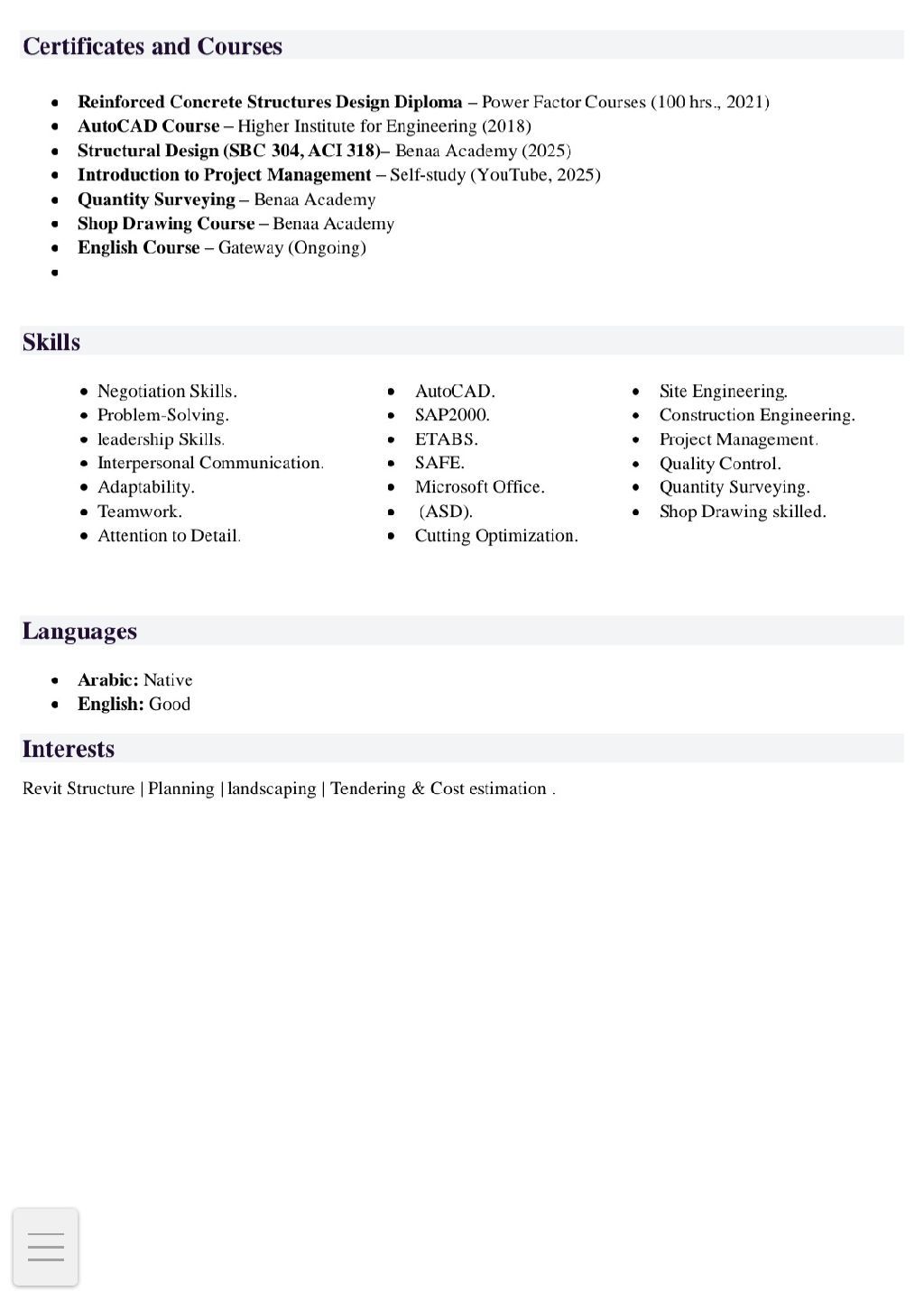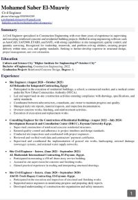 Civil Execution Engineer - Egyptian Over 3 years of hands - on experience in executing concrete elements and finishing works. Proficient in quantity takeoff, preparing shop drawings, and using AutoCAD and Excel efficiently. with strong negotiation and problem - solving abilities. Currently based in the Kingdom of Saudi Arabia and ready to work immediately