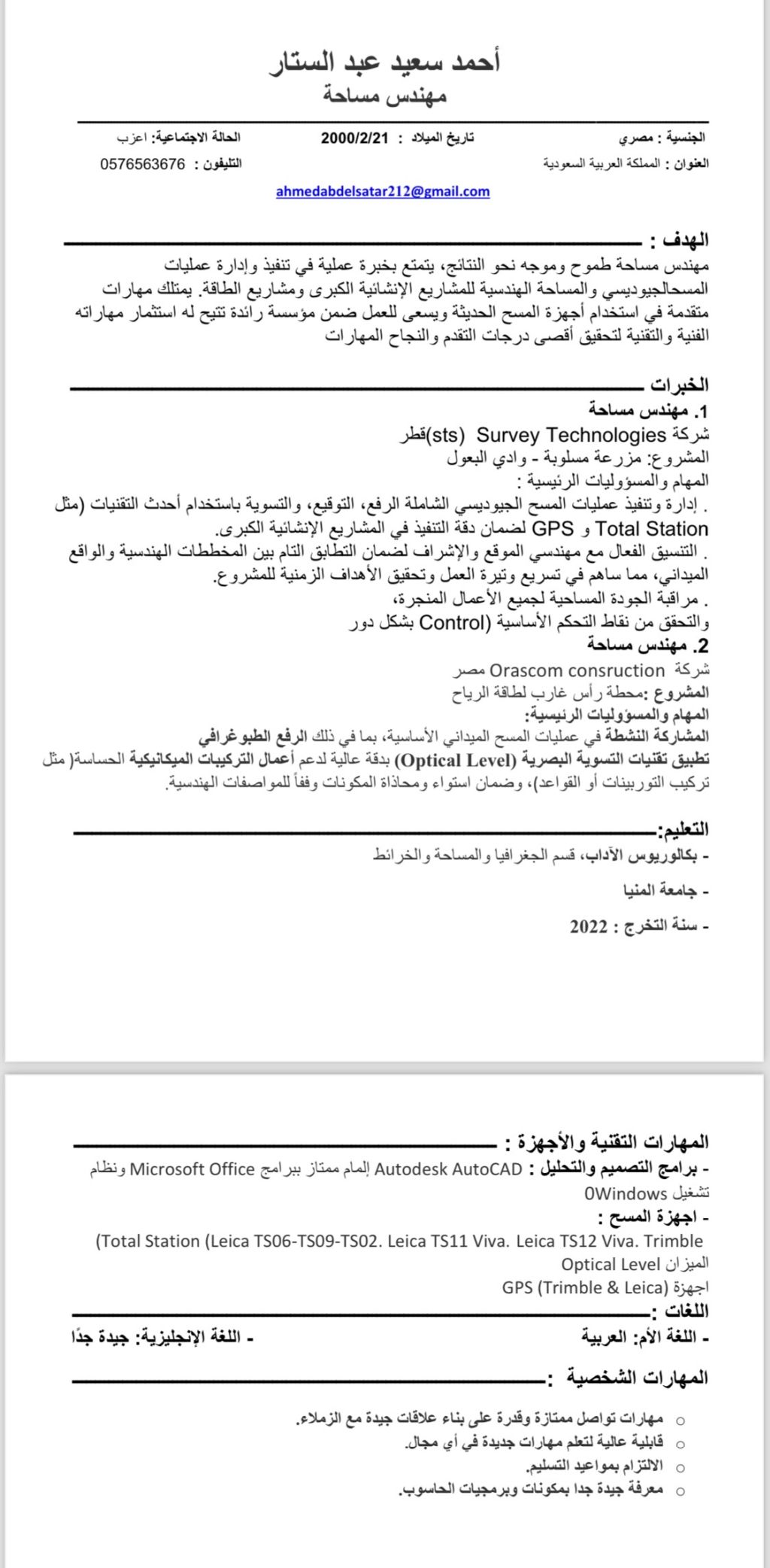 مساح عام وخبرة 5 سنوات في أعمال الانشاءات والبنيه التحتية الصرف الصحي. خريج كلية الآداب قسم الجغرافيا شعبة المساحة والخرائط وايجاده العمل علي برامج (word. AutoCAD. Excel) والتعامل الجيد علي اجهزة المساحة ميزان توتال استيشن وGps وايجاده القيادة