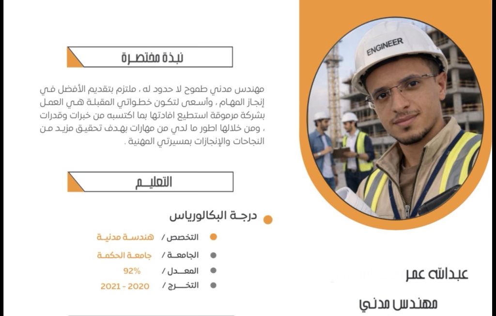 مهندس مدني حاصل على بكالوريوس هندسة مدنية، ابحث عن فرصة عمل مناسبة في مجال الهندسة. أو مجال آخر عملت في هذا المجال لمدة سبعة أشهر في المدينة المنورة التواصل عبر