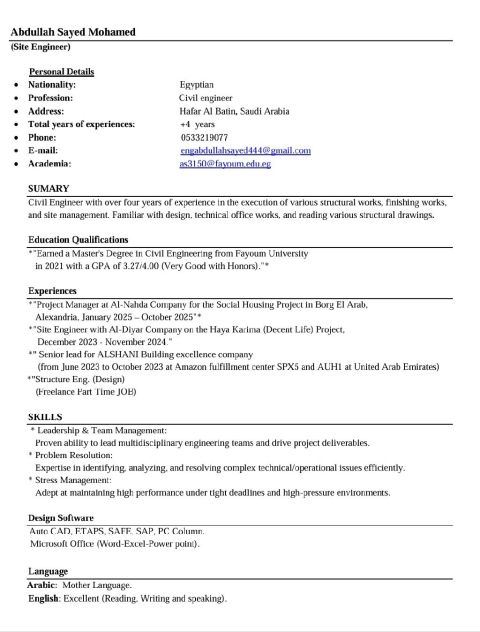 Civil engineer with a bachelor's degree in civil engineering He holds a membership of the Saudi Council of Engineers More than 5 years of experience in site management, supervision and implementation in Saudi Arabia Full knowledge of the work of construction and buildings, bone and finishing Looking for a job opportunity in a contracting company or engineering consulting company