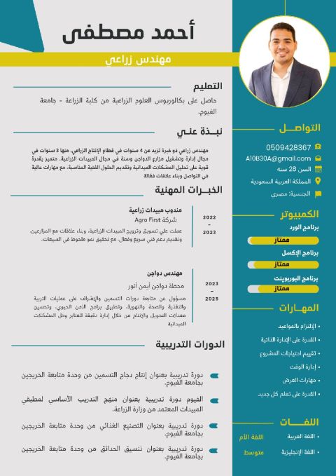 أنا المهندس أحمد حاصل على بكالوريوس الزراعة تخصص الدواجن. امتلك خبرة عملية تفوق ثلاث سنوات في قطاع الدواجن، شملت إدارة دورات التسمين، والاشراف على التشغيل داخل العنابر، وتطبيق معايير الأمن الحيوي، وتحسين الأداء الإنتاجي عبر المتابعة الدقيقة للمؤشرات الفنية. متواجد في المملكة ابحث عن عمل