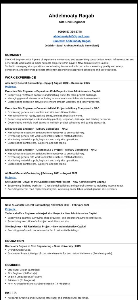 مهندس مدني خبرة 4 سنوات في تنفيذ الخرسانات والتشطيبات. خبرة في الاشراف على المواقع، متابعة التنفيذ، ضبط الجودة، والتنسيق مع المقاولين. عملت في مشاريع سكنية وتجارية ومشروع مصاعد الحرم النبوي متواجد حاليا في المدينة المنورة، ومتاح للعمل فورا والانتقال الى أي مكان داخل المملكة. ابحث عن فرصة عمل