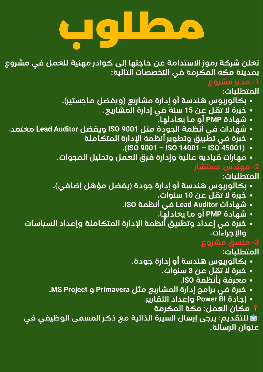 برجاء قراءة الاعلات جيدا من الصورة تعلن شركة رموز الاستدامة للاستشارات البيئية عن حاجتها الى كوادر مهنية للعمل في مشروع بمدينة مكة المكرمة 1 - مدير مشروع خبرة لا تقل عن 15 سنة في إدارة المشاريع. 2 - مهندس مستشار خبرة لا تقل عن 10 سنوات. 3 - منسق مشروع خبرة لا تقل عن 8 سنوات