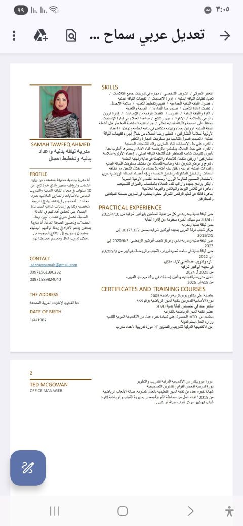 أنا تخصص لياقة بدنية وتأهيل اصابات وبيلاتس ويوجا وتغذية وتدليك خبرة 10 سنوات في دولة الامارات الجنسية مصرية شهادات معتمدة سي في كامل