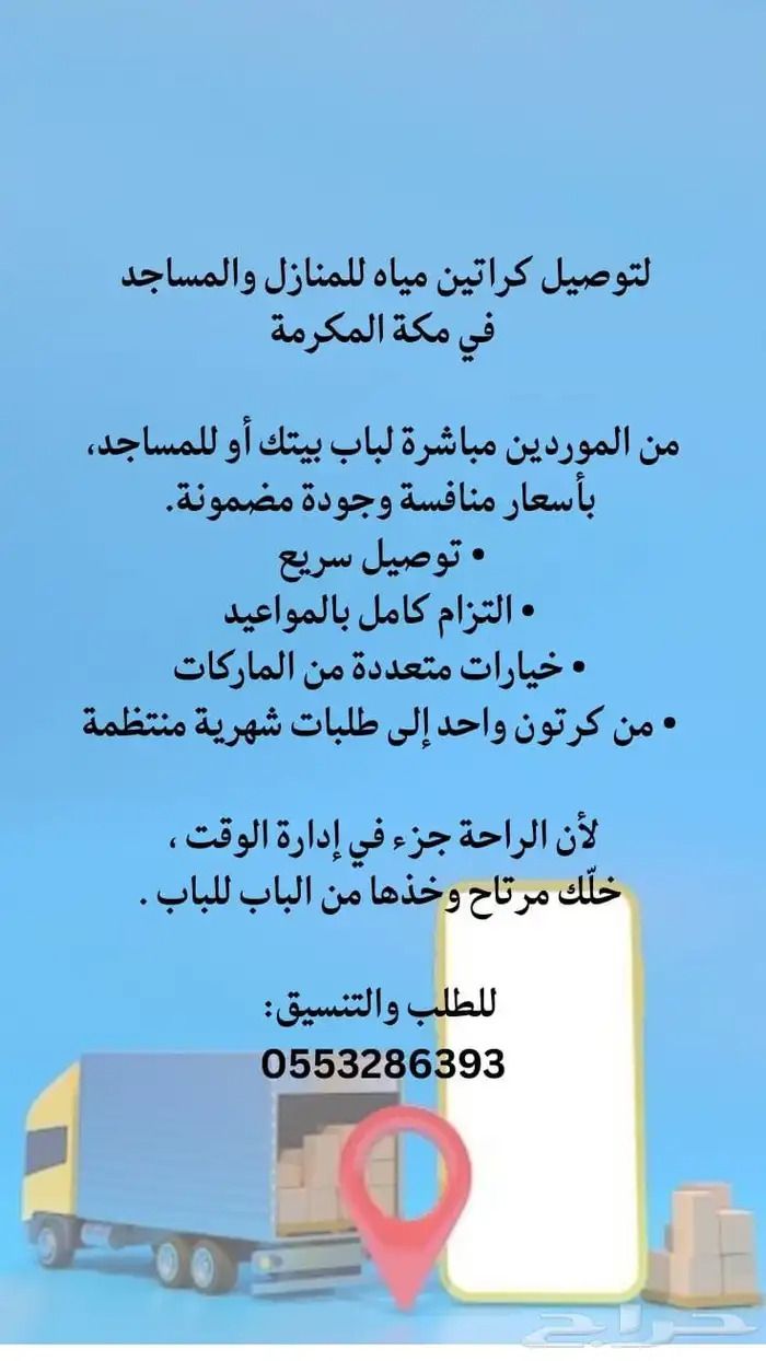 كراتين مياه بسعر مناسب وتوصيل مجاني للمنازل والمساجد والمدارس