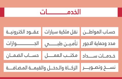 يوجد لدينا جميع الخدمات العامة جميع خدمات ناجز / جميع خدمات ابشر / جميع خدمات البنوك وفتح حساب جاري - جميع خدمات منصة قوى / فك نسبة المهن / ازالة ملاحظة مدد / جميع خدمات التأمينات والمركز الأعمال السعودي / جميع خدمات بلدي / استخراج تأشيرات توثيق زواج جميع خدمات الجوازات ومكتب العمل تعديل مهنة / نقل كفالة لمن لديهم بلاغ تغيب عن العمل / شهادة وتقرير سلامة لتجديد رخصة المنشأة / تحديث صكوك / حصر ورثة