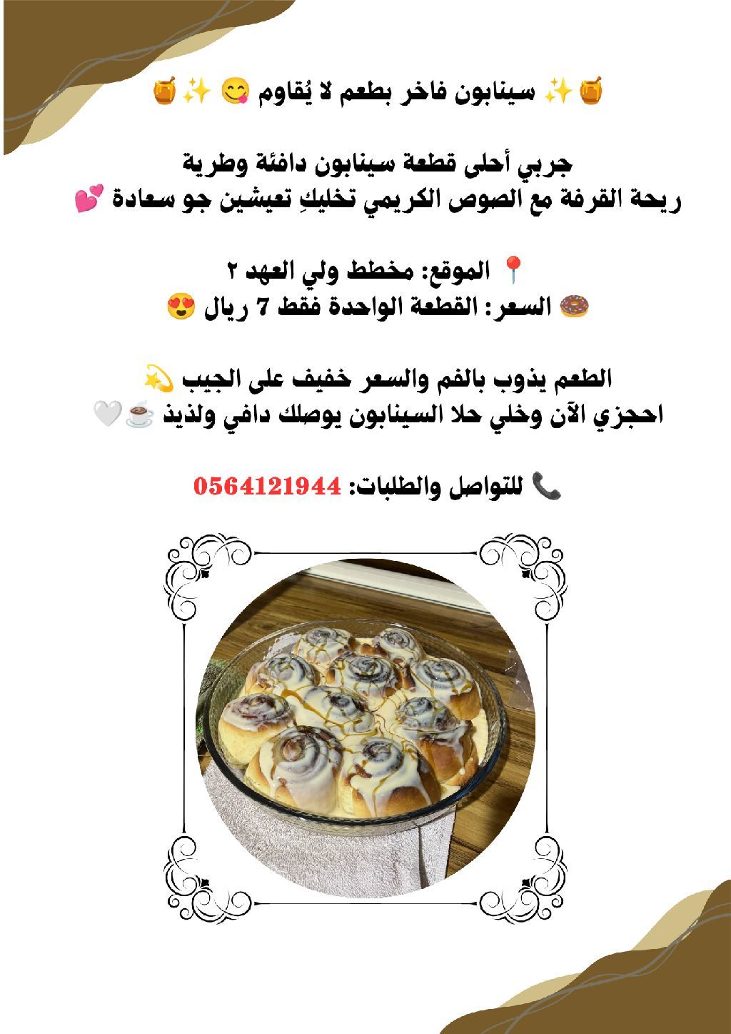 سينابون فاخر بطعم لا يقاوم جربي أحلى قطعة سينابون دافئة وطرية ريحة القرفة مع الصوص الكريمي تخليك تعيشين جو سعادة الموقع مخطط ولي العهد 2 السعر القطعة الواحدة فقط 7 ريال الطعم يذوب بالفم والسعر خفيف على الجيب احجزي الآن وخلي حلا السينابون يوصلك دافي ولذيذ للتواصل والطلبات