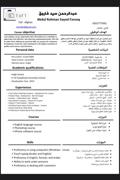 مدخل بيانات وصاحب قدرة على استخدام برامج مايكروسوفت والالتزام والتطوير والتحسين المستمر، والقدرة على التحدث بلغتين العربية والانجليزية