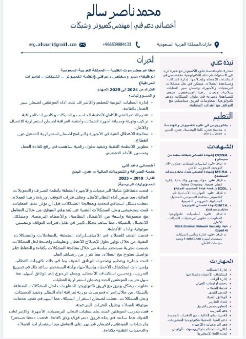 ابحث عن فرصة للعمل في شركة بوظيفة IT support تثبيت أنظمة التشغيل وعمل نسخ للسيرفر والبيانات وحل مشاكل الاجهزة والطابعات أو system Administrator إدارة سيرفرات وفايرول وأنظمة البصمة أنظمة الكاميرات شركة أو أي مؤسسة تجارية هذه سيرتي الذاتية