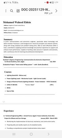 مهندس كهرباء حاصل علي كورس Distribution وأجيد العمل ببرامج الاوتوكاد وDialux Evo وأجيد تصميم وتنفيذ lighting - power - panels schedule حاصل علي بكالوريوس هندسة اتصالات والكترونيات مقيم في مكة وعندي سكن في جدة