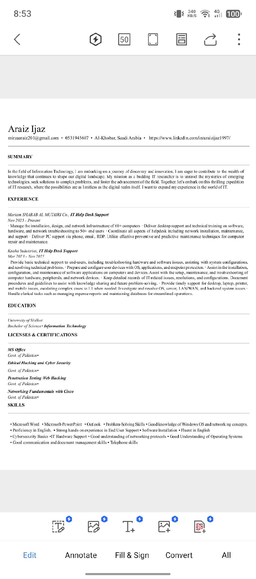 محترف دعم تقني (IT support) ذو خبرة عملية في أنظمة Windows وOffice 365، واستكشاف أخطاء الاجهزة والبرامج، ودعم المستخدمين النهائيين. متمكن من اعداد اجهزة الكمبيوتر المكتبية والمحمولة، دعم الطابعات، أساسيات شبكات LAN / WAN، الدعم عن بعد، وصيانة الأنظمة. حاصل على بكالوريوس تقنية معلومات مع شهادات في Microsoft Office وأساسيات الشبكات (Cisco) والأمن السيبراني