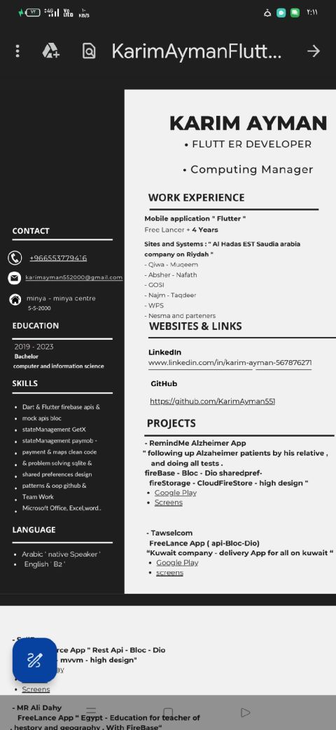 أنا مصري 25 سنة خريج هندسة الحاسبات ومعلومات قسم نظم المعلومات، مبرمج اشتغلت فترة فشركة مقاولات كبري في الرياض لجميع الخدمات علي السيستم، ولدي معرفة كبيرة في جميع الأنظمة، سريع علي اللابتوب ومتقن ومتواجد معي لابتوب شخصي. وفي نفس الوقت مبرمج تطبيقات اندرويد خبرة 4 سنين Framework flutter. إقامة سارية ومتواجد في الرياض ومتاح للعمل