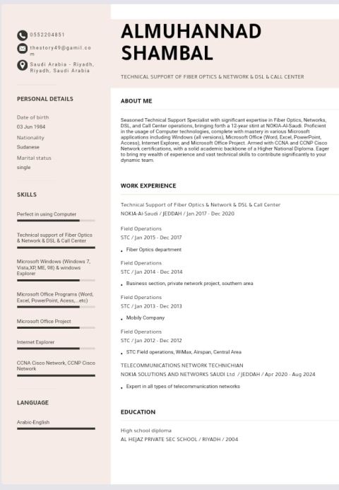 فني شبكات اتصالات الألياف البصرية الشبكات الداخلية وأبراج الاتصالات تمديد كيا بل الفايبر ولحام الفايبر تركيبات وصيانة العمل مسبقا نوكيا السعودية ملم بعمل على الحاسب الآلي ادخال البيانات اجادة العمل على برامج الأوفيس وخدمة العملاء وعمل التقارير اليومية