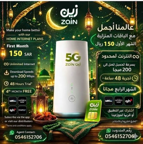With Zain 5G, enjoy the strongest unlimited 5G internet at speeds of up to 200 Mbps. No lag, no disconnections, stable and strong internet all day long. Offer features Unlimited internet, fully open speed, strongest 5G coverage in the Kingdom, suitable for gaming, downloading, streaming, and work. If you want comfort, speed, and stability, then Zain 5G is your first choice. To subscribe and conta