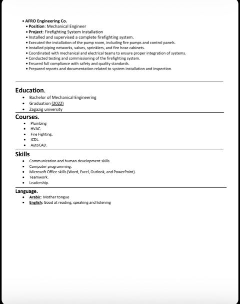 مهندس ميكانيكا مصري خبرة 3 سنوات في مجال fire fighting systems, HVAC, plumbing سواء صيانة أو تنفيذ داخل المملكة متواجد في المدينة وجاهز للعمل في أي مكان آخر في المملكة