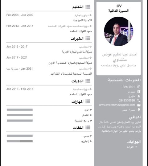 محاسب وأمين مستودع مصري خبرة سنتين في المحاسبه واعداد القوائم المالية والميزانيات وخبرة ببعض برامج المحاسبه وبرامج مايكروسوفت أوفيس (أكسيل - ورد) وملم بمهارات الحاسب الآلي وسريع الفهم والتطور واسعي للتعلم والأداء لجيد