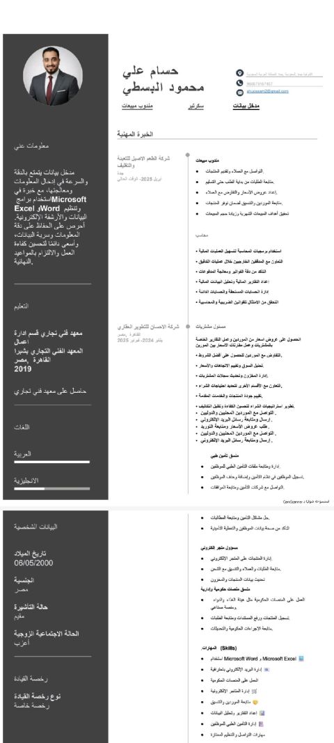 ابعث عن شغل أنا مصري الجنسية عندي 26 سنة سكرتير أو مندوب مبيعات أو مدخل بيانات افهم في منصة الغذاء والدواء لتسجيل المنتجات افهم في ادخال الفواتير الالكترونية وافهم في سيستم المحاسبي اشتغل علي الأكسيل وورد أقدر أقدم تقرير مبيعات وتحصيل العمل معيا رخصة قيادة أقدر اشتغل في المتجر الالكتروني