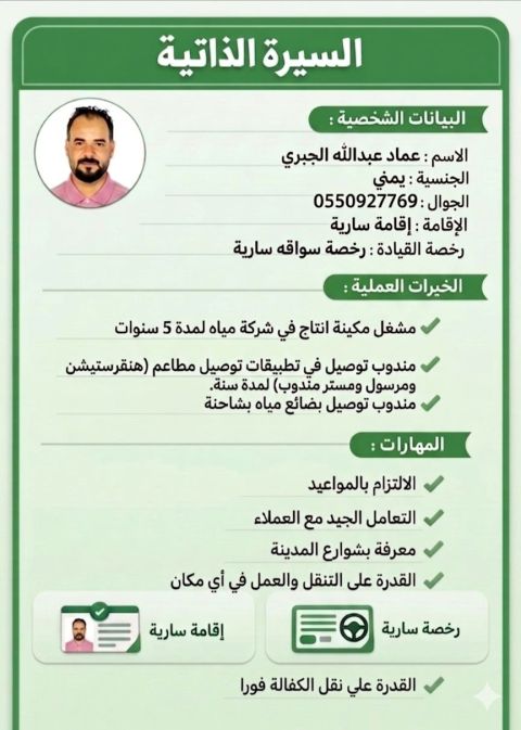 اسمي نصر أحمد محمد وعمري 29 سنة يمني الجنسية والإقامة سارية عملت في المملكة العربية السعودية لمدة 7 سنوات واكتسبت خلالها خبرة عملية واسعة. عملت كأمين مستودعات ومدير صالة ومشرف عمال وبائع ومصفف أرفف. أنا لبق في الكلام، حريص ومجتهد في عملي، ولدي القدرة على تطوير أي نشاط اعمل به المجالات التي عملت بها تشمل المحلات التجارية، والمواد الغذائية والكماليات