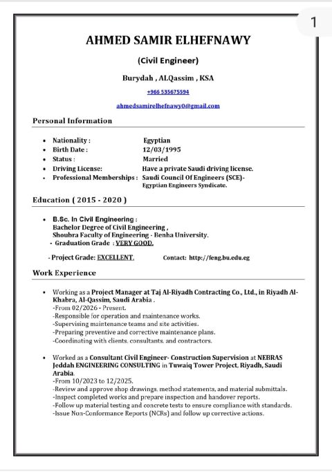 Civil engineer with 6 years of experience, including 3 years in KSA (concrete works, finishing, and engineering offices supervising construction) registered with the Saudi Council of Engineers, holding a valid Saudi driver's license and a valid, transferable Iqama, Currently residing in ALQASSIM and willing to work anywhere in KSA in a suitable work environment