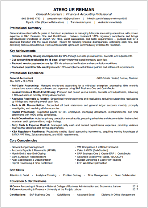 I am looking for a General Accountant position with over 3 years of experience in end - to - end accounting, financial reporting, and ERP management. Proven ability to manage general ledgers, process payroll, and ensure compliance with financial regulations. Technical proficiency includes SAP Business One, Quickbooks, and advanced Excel. Understanding of Saudi ZATCA, VAT, and GOSI regulations