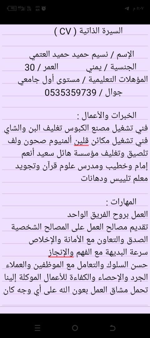 ابحبث عن عمل الجنسية يمني عندي خلفيه في البقالة وفي أتوصيل أتواصل ابر ارقم