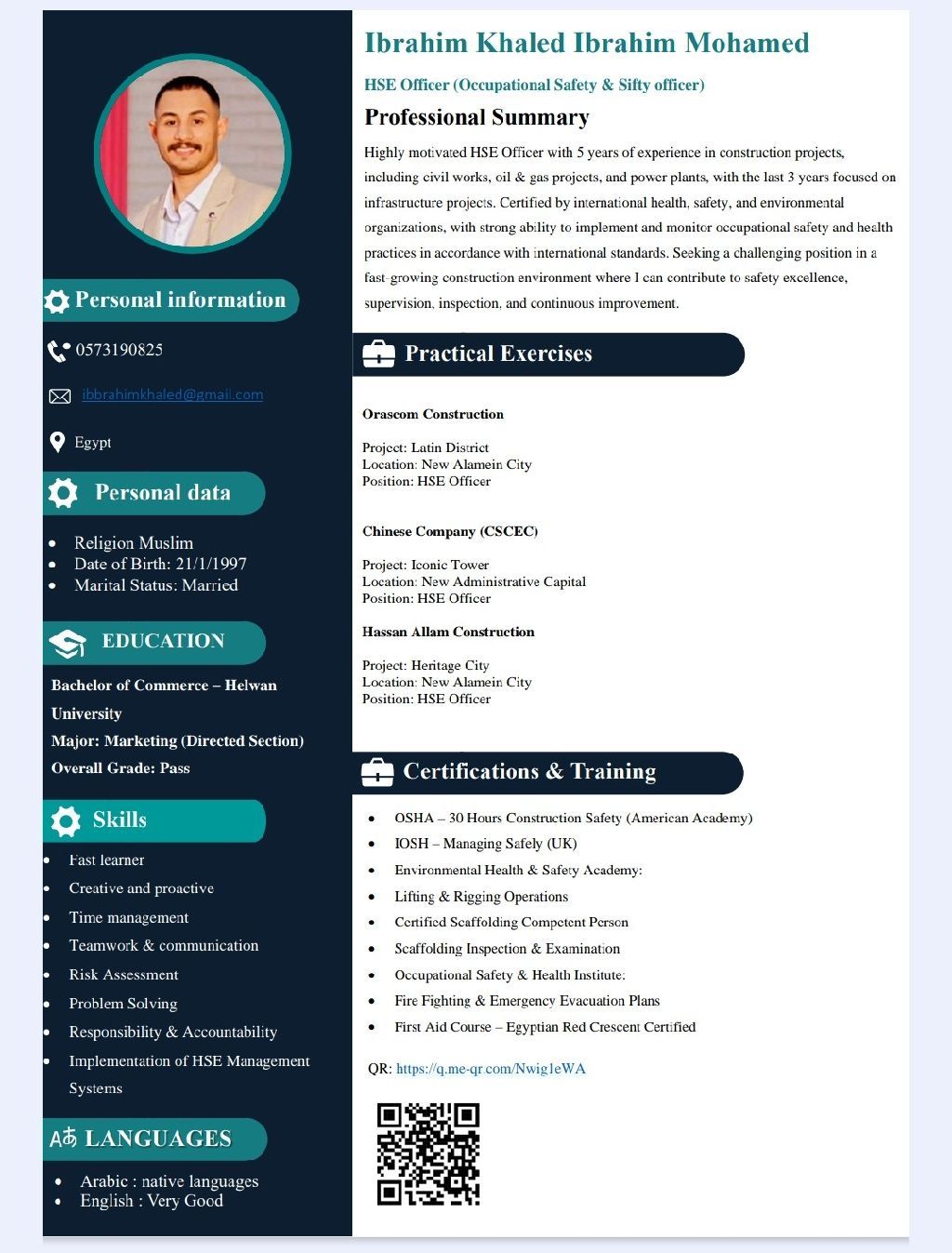 مشرف سلامه وصحة مهنية خبرة في مواقع الإنشاءات حاصل على دورات الاوشا والايوش والشخص المختص بفحص السقالات والأوناش وكورس الاسعافات الأولىه والحرائق وخطط الاخلاء متواجد في السعودية