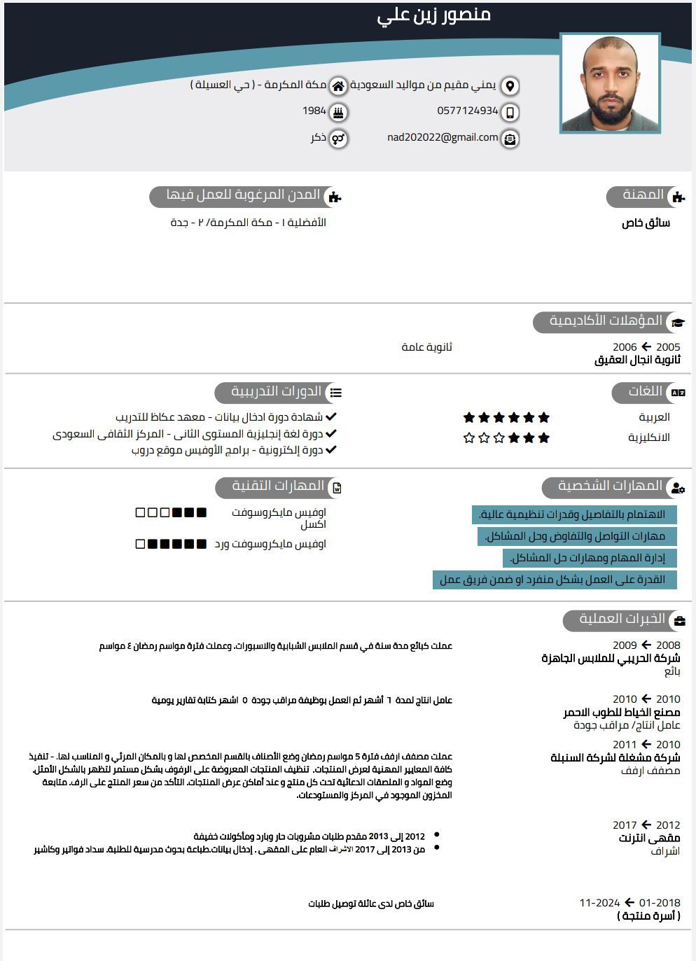 ابحث على وظيفة بسكن في شركة - مؤسسة مصنع. في مكة المكرمة أو مدينة جدة ولا مانع من العمل بمدينة جدة أن توفر سكن دوام كامل دائم أو موسمي. الوظائف المرغوبة مدخل بيانات - مصفف أرفف - اشراف - عامل انتاج أو تعبئة وتغليف - عامل مقصف عامل عادي - بائع. إقامة سارية المفعول. عدد مرات نقل الكفالة مرة واحدة