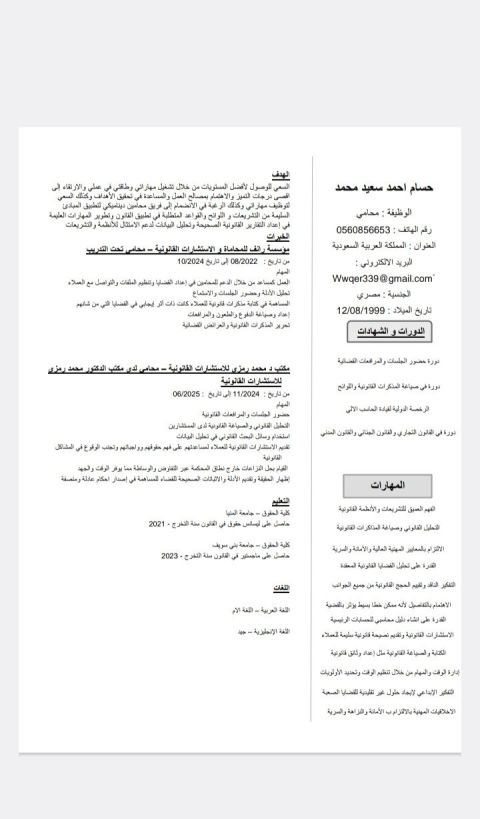 مستشار قانوني خبرة سنتين في المملكة العربية السعودية وملم باللوائح والقوانين واعداد المذكرات والعرائض ودراسة القضايا ومتاح للعمل