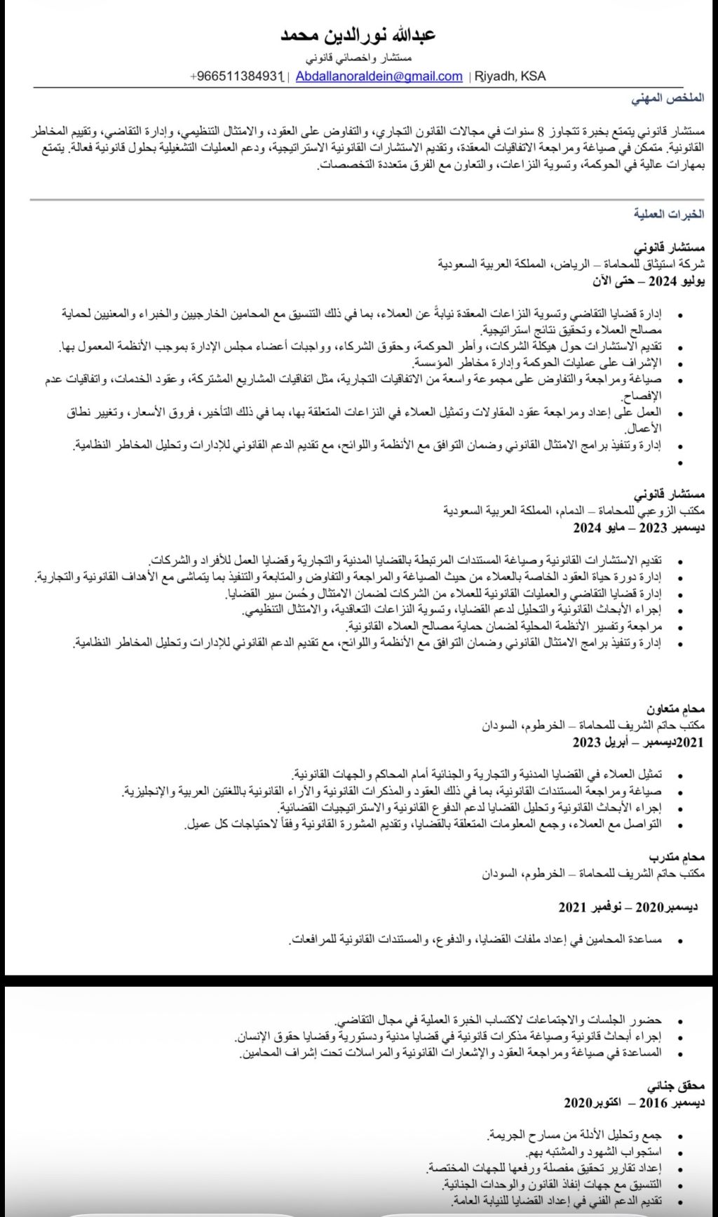 مستشار قانوني بخبرة تتجاوز 8 سنوات (عامين) داخل المملكة في القانون التجاري، الحوكمة، وإدارة التقاضي المعقدة، مع تخصص دقيق في صياغة عقود المقاولات والاتفاقيات التجارية. وتحليل المخاطر النظامية، وتسوية النزاعات بفعالية. ممارس ومدقق معتمد في الحوكمة والمخاطر والامتثال (GRCP & GRCA) وحاصل على شهادة أنظمة ولوائح السوق المالية (CME - 1B) ومتمكن في تقديم الاستشارات الاستراتيجية