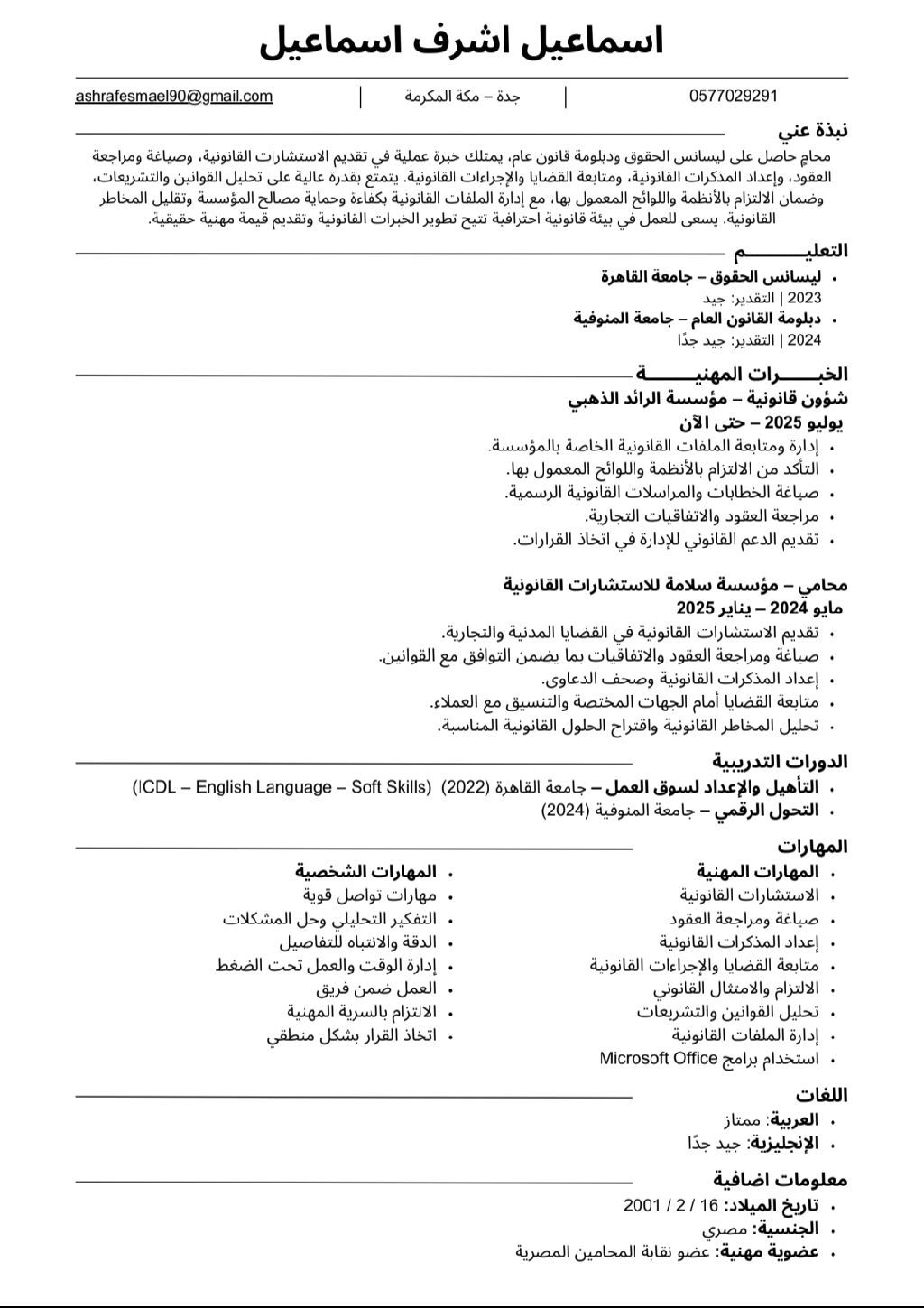 مستشار قانوني حاصل على ليسانس الحقوق ودبلومة في القانون العام، امتلك خبرة في تقديم الاستشارات القانونية وصياغة ومراجعة العقود والاتفاقيات، واعداد المذكرات القانونية، ومتابعة الاجراءات النظامية، مع الالمام بالأنظمة واللوائح المعمول بها في المملكة العربية السعودية. أتمتع بقدرة تحليل قانوني عالية، والالتزام بمتطلبات الامتثال النظامي، ودعم متخذي القرار بما يحفظ حقوق المنشأة ويحد من المخاطر القانونية