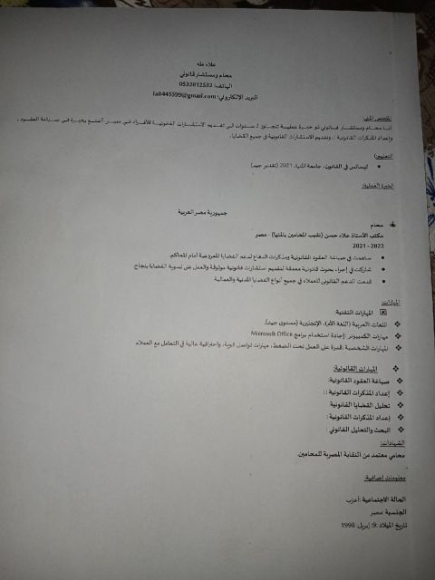 اعلن عن رغبتي في ايجاد فرصة عمل في مجال المحاماة والقانون السعودي داخل المملكة خريج شريعة وقانون خبرة في مجال المحاماة والقانون المصري امتلك مهارات البحث القانون وتقديم الاستشارات القانونية وفقا للأنظمة المعمول بها والقدرة على صياغة المذكرات واللوائح بأسلوب رصين أن أولويتي القصوى في هذه المرحلة هي الانضمام الى بيئة عمل ملهمة تساعدني على التطور المهني