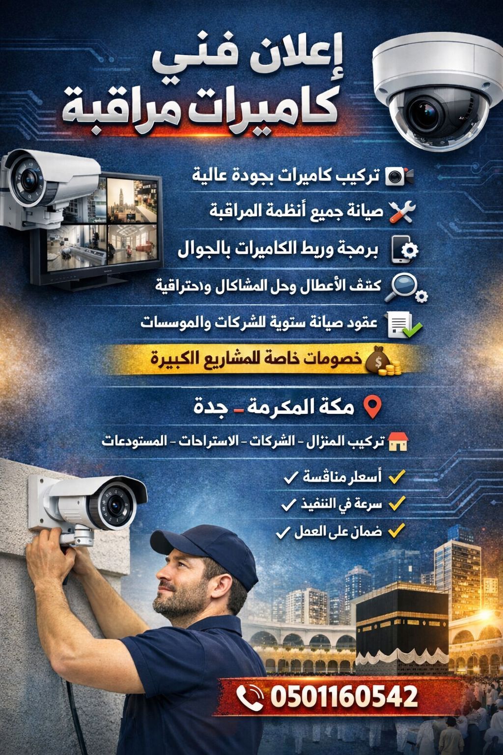 تركيب كاميرات مراقبة بجودة عالية صيانة جميع أنظمة المراقبة برمجة وضبط اعدادات الكاميرات وربطها بالجوال كشف الأعطال وحل جميع المشاكل بسرعة واحترافية عقود صيانة سنوية للشركات والمؤسسات خصومات خاصة للمشاريع الكبيرة تركيب للمنازل - المحلات - الشركات - الاستراحات - المستودعات