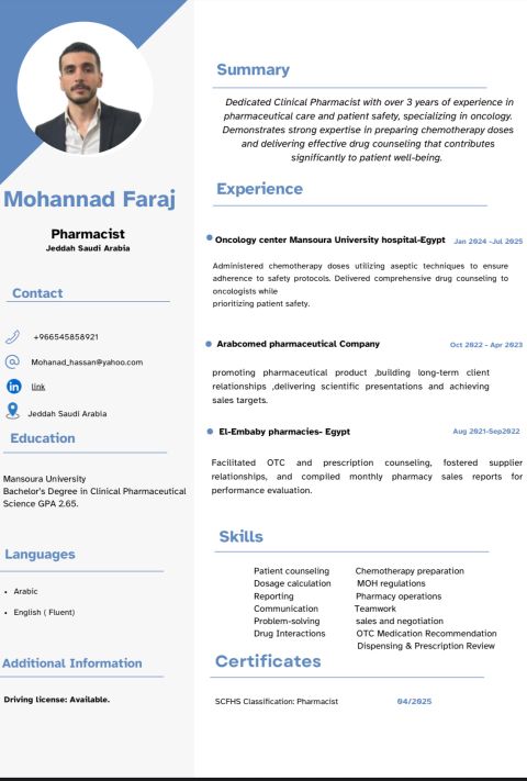 صيدلي خبرة 3 سنوات في مجال العمل الصيدلي أتطلع لفرصة عمل مناسبة داخل المملكة