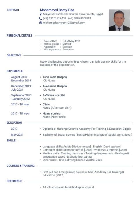 تمريض خاص بخبرة 10 سنوات في المستشفيات والعيادات الخارجية والتمريض المنزلي، مع خبرة في العناية المركزة والطوارئ والعناية بالجروح العميقة