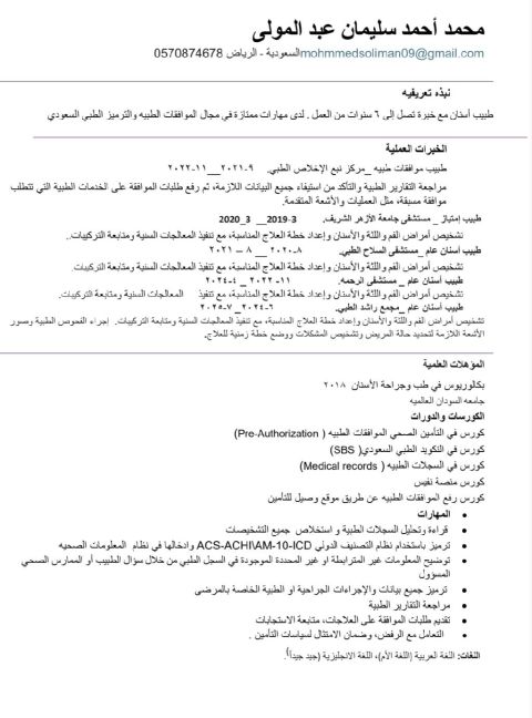 طبيب عام) حاصل على تصنيف الهيئة السعودية للتخصصات الصحية (تأشيرة زيارة. العمل على عقد أجير) خبرة بالطوارئ وعيادات الطب العام (سوري الجنسية