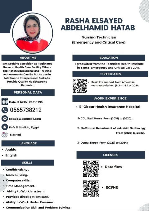ممرض مصري 24 سنة ابحث عن وظيفة خبرة 4 سنوات في الرعاية الصحية والاستقبال للمرضى قوات التواصل والتعامل مع المرضى مراقبة الحالة الصحية للمرضى وتسجيل التغيرات القادره علي ادارة الادوية والعلاجات الطبية التواصل الفعال مع المرضى حاصل علي دورة تدريبية في الاسعافات الأولية حاصل علي الدورة التدريبية المكثفة في دعم الحياة ومكافحة العدوى