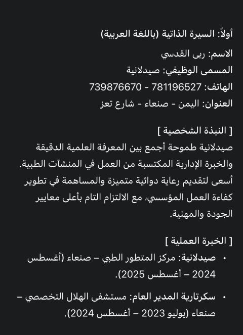 مساعد صيدلي خبرة 10 سنوات في مجال الصيدليات والمستودعات ومعي شهادات خبرة مصري الجنسية العمر 30 عام إقامة سارية المفعول مسؤول عن أي عمل يخص الصيدلية ترتيب وتصفيف الادوية حسب التاريخ مسؤول عن الاكس بئر وأصناف منتهية الصلاحية واستلم الطلبيه والتشيك عليه ومعون مع الدكتور ومساعدته وتنفيذ ما يتطلب منه علي خلق حسنة وأتحمل ضغط العمل وابحث عن فرصة عمل