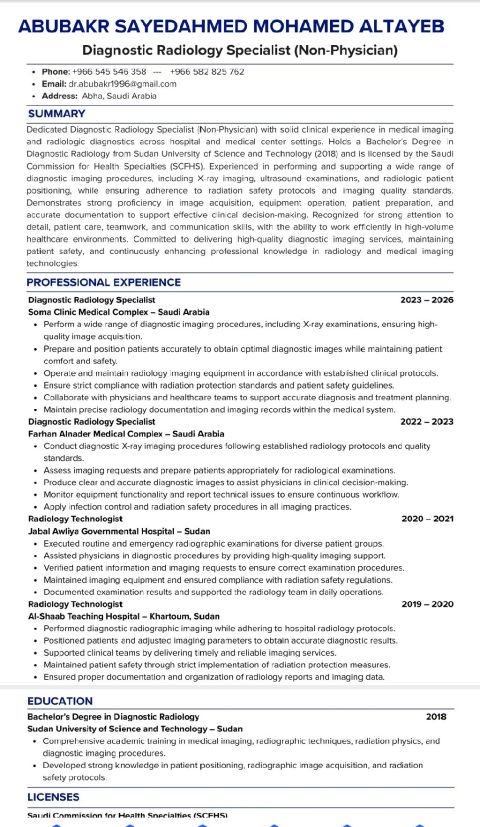 أخصائي أشعة تشخيصية حاصل على تصنيف الهيئة السعودية وخبرة في مجال الأشعة داخل المملكة 4 سنوات وخارجه 5 سنوات وخبرة في مكافحة العدوي إقامة سارية أكثر من سنة وتصنيف ساري محتاح للعمل في أي منطقة بالمملكة خبرة في كل فحوصات الأشعة السينية وأشعة البانوراما وسونار البطن والحوض