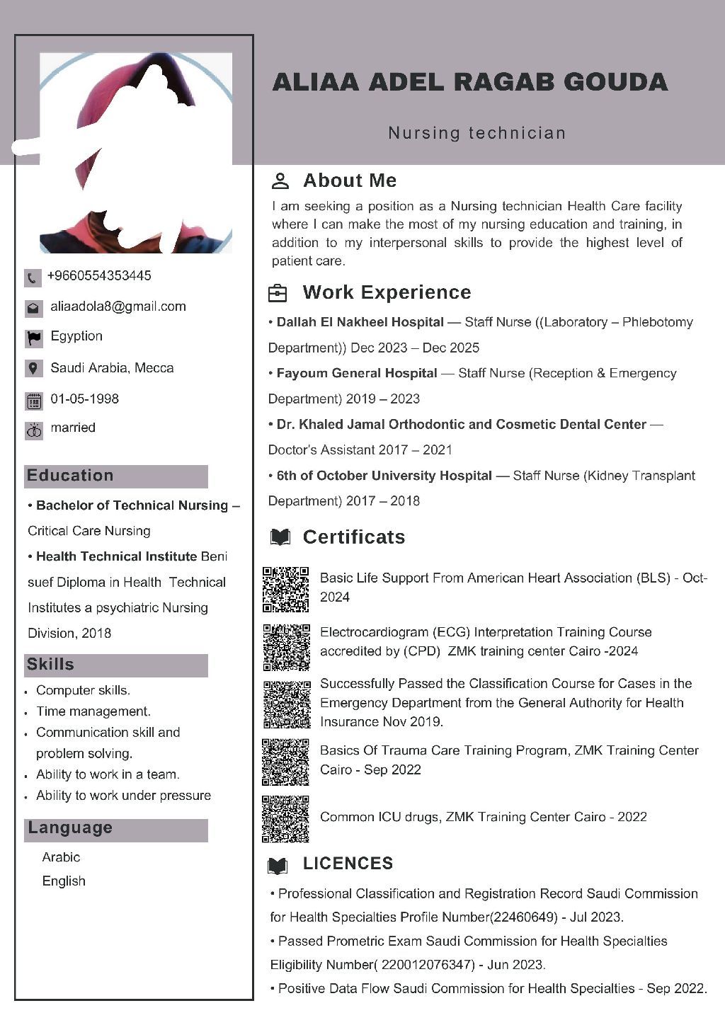 فنيه تمريض مصرية خبرة سنتين داخل السعودية في مستشفى دلة النخيل لدي جميع التراخيص وإقامة سارية ابحث عن نقل كفالة في مكة أو جدة