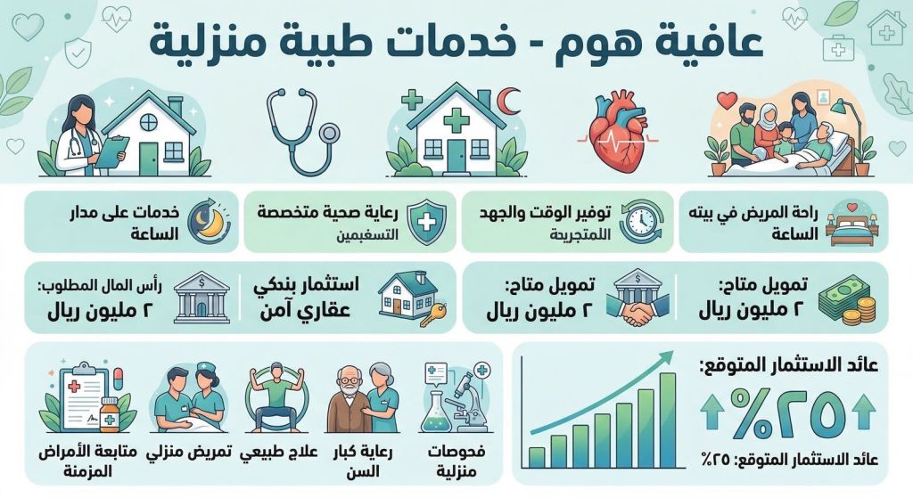يوجد مشروع قائم بالفعل في المجال الطبي ومجال التجميل والسياحة العلاجية والعيادات الطبية المنزليه ويحتاج الى دعم التوسعة وتوجد قوائم ماليه بالأرباح خلال الشهور الماضيه نبحث عن مستثمر استراتيجي يشاركنا في مرحلة التوسع مقابل حصة لا تتجاوز 7، مع تقديم عائد استثماري مستهدف مرتفع (نمو سريع في قطاع home healthcare) دخول في سوق متنامي مدعوم برؤية 2030 - نموذج عمل قابل للتوسع في عدة مدن
