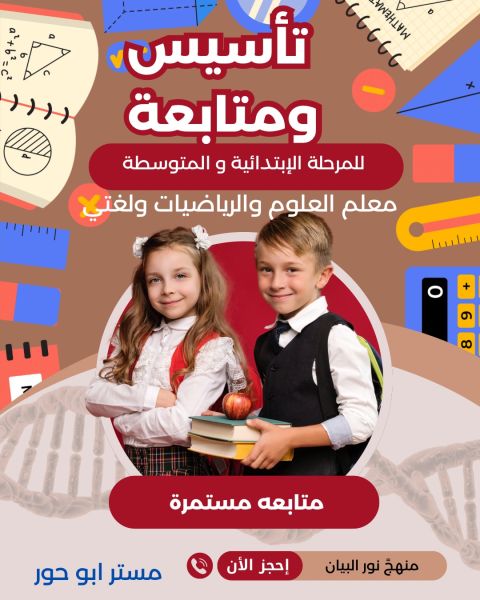 تبي طفلك يتأسس صح ويحب الدراسة يا هلا فيكم. اذا شايل هم تأسيس طفلك أو تبغى أحد يتابعه في دروس الابتدائي بأسلوب ممتع ومبسط، أنا هنا للمساعدة نقدم دروس تقوية وتأسيس في جميع المواد الدراسية تأسيس قوي لغة، رياضيات، وغيرهم. متابعة يومية حل واجبات ومراجعة للاختبارات. شرح مبسط نوصل المعلومة بعيدا عن التعقيد. الموقع خميس مشيط) أو (اونلاين) الأسعار مناسبة جدا