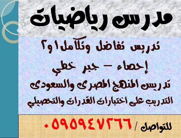 معلم رياضيات للمرحلة الثانوية والجامعية تفاضل وتكامل (1) تفاضل وتكامل (2) احصاء - التدريب علي اختبارات القدرات والتحصيلي + تدريس أون لاين