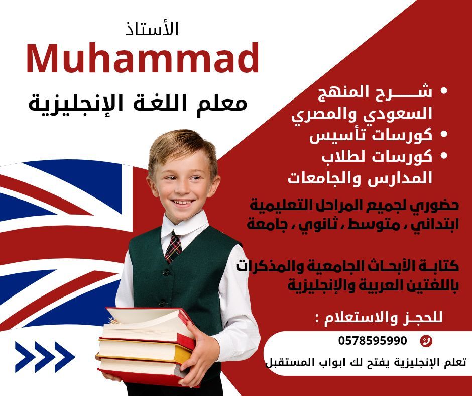 معلم مصري للغة الانجليزية لجميع المراحل التعليمية. خريج كلية التربية شعبة اللغة الانجليزية جامعة الأزهر في القاهرة. تدريس المنهج السعودي والمصري لجميع المدارس الأهلية والدولية لجميع المراحل ابتدائي، متوسط، ثانوي، جامعة. تأسيس للاطفال والطلاب في اللغة الانجليزية من الصفر وحتى الاحتراف. كورسات لطلاب المدارس والجامعات لرفع المستوى والتحصيل الدراسي. كتابة الأبحاث الجامعية العلمية والمذكرات