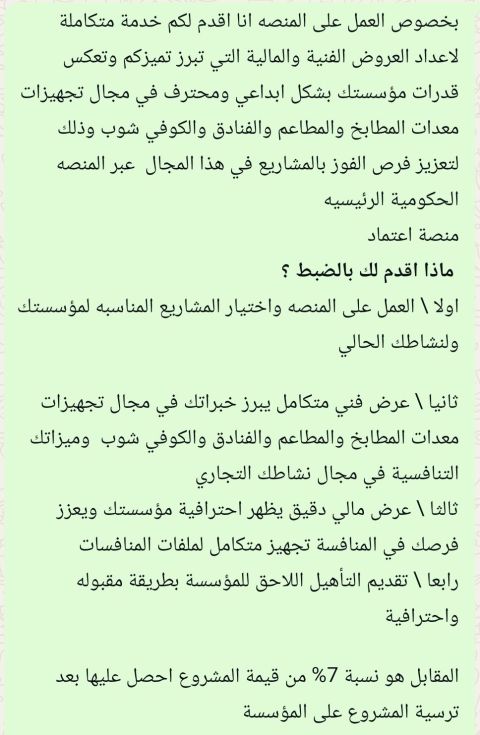 أقدم لكم خدمة متكاملة لاعداد العروض الفنية والمالية التي تبرز تميزكم وتعكس قدرات مؤسستك بشكل ابداعي ومحترف في مجال تجهيزات معدات المطابخ والمطاعم والفنادق والكوفي شوب وذلك لتعزيز فرص الفوز بالمشاريع في هذا المجال عبر المنصة الحكومية الرئيسية منصة اعتماد